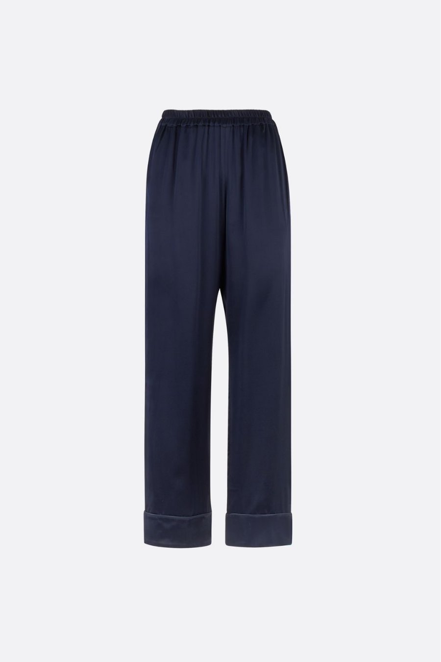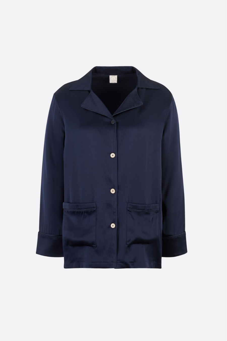 The shirt boasts a relaxed silhouette, adorned with distinctive notch lapels, front pockets, and elegant tonal dark navy piping for a touch of sophistication. Meanwhile, the timeless straight-leg trousers feature an elasticated waistband, offering both comfort and a flattering fit. Side pockets complete the ensemble.