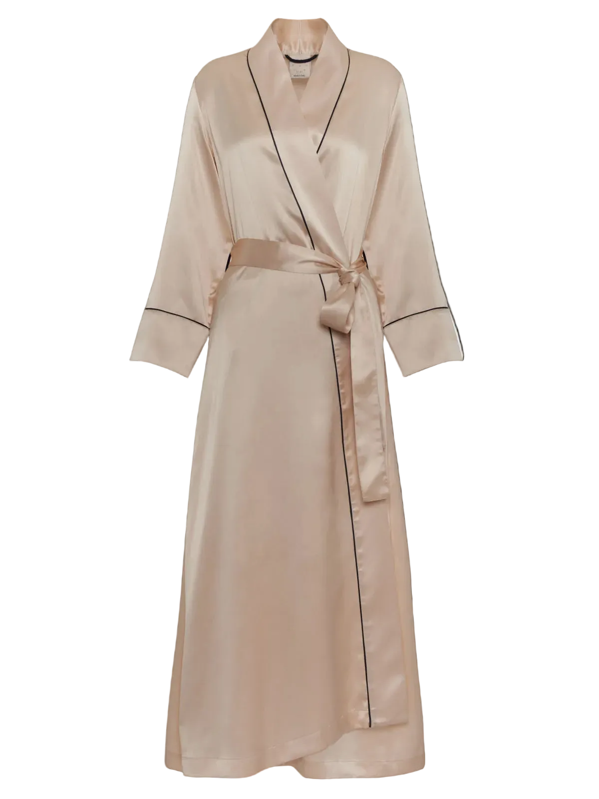 Our classic Jade robe boasts a maxi-length hem, enhancing its elegant draping. This exquisite piece is meticulously finished with contrast piping and adorned with mother-of-pearl buttons on the belt loops, adding an opulent touch to your evening attire.