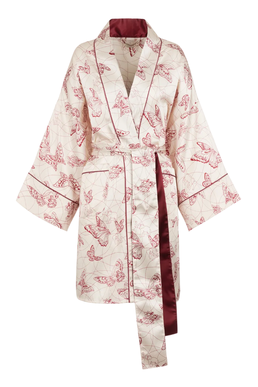 Created exclusively for our collaboration with La Réserve Paris, the “Suite 504” capsule is a tribute to intimacy, elegance, and quiet luxury. At its heart lies a bespoke hand-drawn print, inspired by a rare Japanese Art Deco katagami stencil. The motif unites two emblems: the butterfly, our enduring icon of transformation, and the elephant, La Réserve’s gentle guardian of memory and grace. Rendered in soft ivory with accents of La Réserve red, the design flows across silk with a rhythm that is both playful and serene.