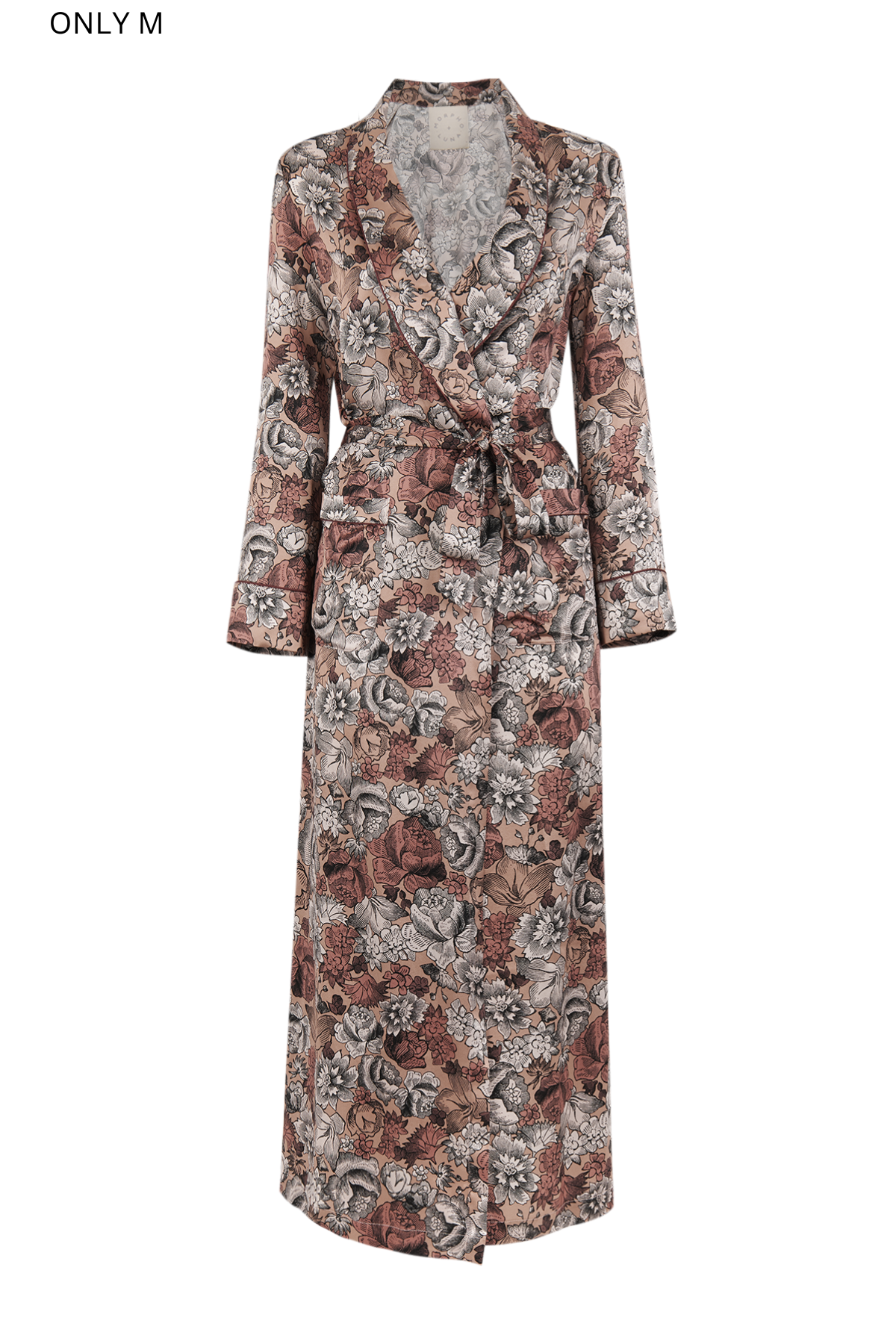 In a pretty palette of dusky pinks and shimmery, silvery tones, our Bianca robe features our striking ‘Jardin de Nuit’ floral print twirling against a backdrop of glowing mulberry silk. From Austrian Edelweiss’ to sweet wild roses and Japanese peonies, each of the flowers chosen has been carefully handpicked to carry secret but uplifting messages of courage, strength, love, hope and desire, enchantingly told through symbolism unique to the language of flowers and inspired by botanical drawings found in 17th and 18th century pattern books.